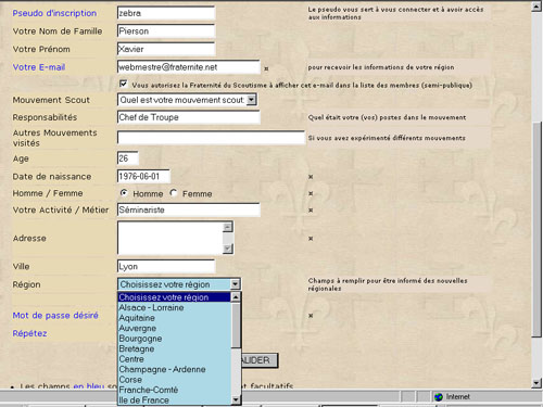 Veillez à remplir au moins les champs en bleu. Vous aurez tout loisir de remplir les autres champs plus tard. La région, bien que non indispensable, vous permettra d'être déjà autorisé(e) à publier dans la rubrique concernant cette région, et de recevoir des informations spécifique à celle-ci (de même pour le mouvement scout).