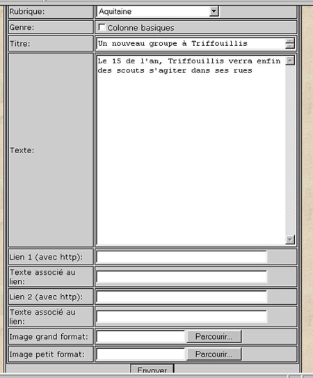 Si vous vous rendez dans la rubrique privée qui vous est réservée, vous verrez que vous avez le droit de publier un article. Vous pouvez ainsi donner une nouvelle, ou une demande, que seuls les autres membres de la région pourront lire, et éventuellement commenter. Le webmestre décidera si la nouvelle peut être mise en lecture publique, et le fera chaque fois que c'est possible (en transférant le texte dans la rubrique publique de la même région).
